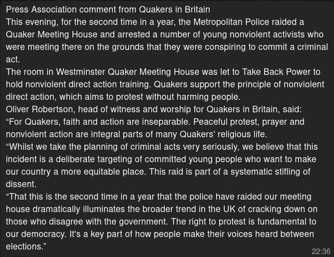 Statement from Quakers in Britain about tonight's police raid on Westminster Meeting House. Guys, I don't think they're buying the Met's line about the nonviolent direct action training being a cover for plotting "mass shoplifting"