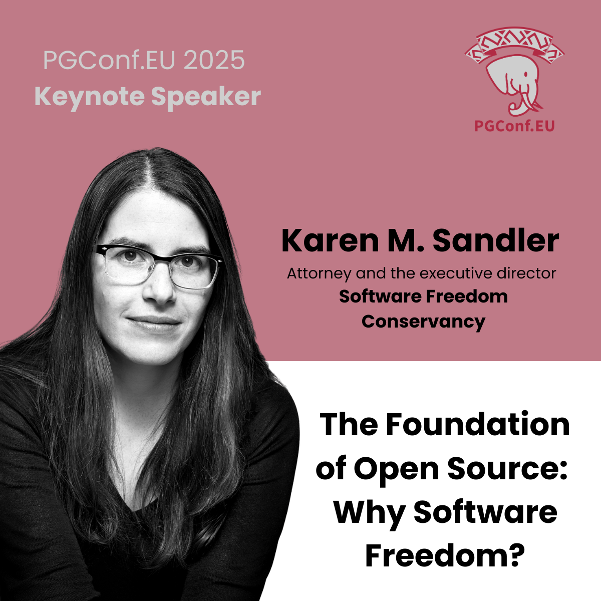 We’re excited to announce our #PGConfEU 2025 keynote speaker — Karen M. Sandler, attorney and Executive Director of the Software Freedom Conservancy!