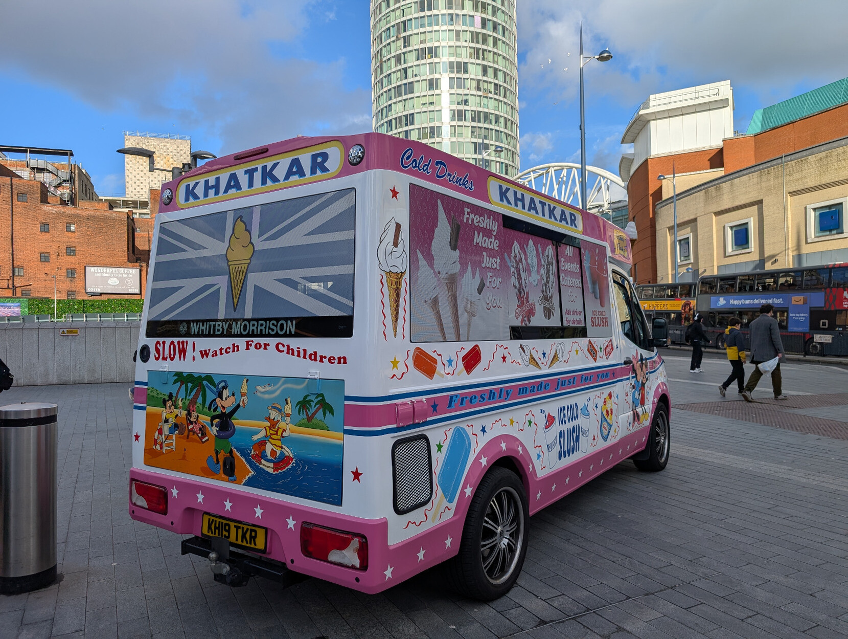 @jezhiggins 1000 Trades Square, just now. Middle aged man with dark hair and dark jacket seen buying cone for small boy of similar description.